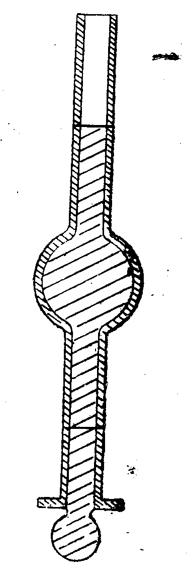 Прибор сталагмометр (греч. сталагма - капля) представляет собой стеклянную трубку с шарообразным расширителем (рис 2), выше и ниже которого на стекле нанесены две метки, ограничивающие некоторый объем набираемой между этими метками жидкости. Нижний конец трубки сделан в виде плоского хорошо отшлифованного диска. Для засасывания жидкости в сталагмометр служит резиновая груша.