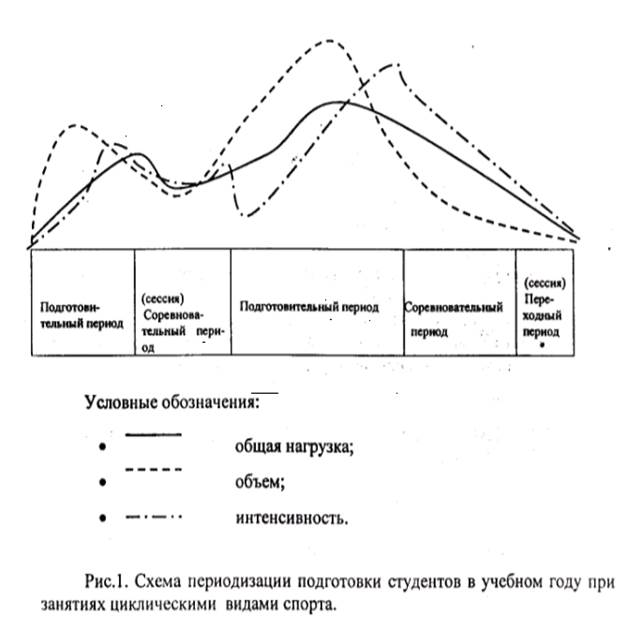 Считается, что в учебном году, в макроцикле общий объем тренировочных нагрузок должен постепенно нарастать к сессионному периоду и снижаться до активного отдыха непосредственно в период сдачи зачетов и экзаменов. Важным моментом является непрерывность занятий физическими упражнениями во время каникул (рис. 1).