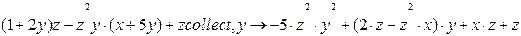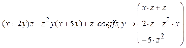 Операция полностью аналогична предыдущей с той разницей, что результатом является вектор, состоящий из коэффициентов при соответствующих степенях переменной, относительно которой приводятся подобные слагаемые, начиная со свободного члена и далее по увеличению степени переменной. Выполняется с помощью пункта меню Символика / Полиномиальные коэффициенты или ключевого слова coeffs панели Символика.