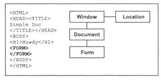Теперь можно переделать файл HTML так, чтобы он содержал пустые дескрипторы формы <FORM>. На рис. 4.8 показано, как при этом изменится документ HTML (изменения выделены полужирным начертанием) и соответствующая ему структура объектов, создаваемая браузером. Даже если между дескрипторами формы <FORM> ничего не введено, одного их наличия достаточно для того, чтобы браузер создал объект формы — form. Обратите внимание также на то, что объект form, согласно текущей иерархической структуре, содержится внутри объекта документа.