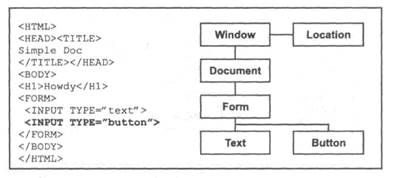 Последнее изменение, которому будет подвержен файл, предназначено для добавления на ту же самую форму еще и кнопки (button), подобно тому, как это реализовано для текстового поля (рис. 4.10). Обратите внимание, что дескриптор кнопки, как и дескриптор текстового поля, находится между дескрипторами формы <FORM>. В результате на иерархической структуре объектов оба эти элемента — текстовое поле и кнопка— показаны помещенными в объект формы form. Если проводить аналогию с иерархией должностей в компании, то такая ситуация соответствовала бы двум подчиненным, занимающим равноценные должности и подчиненных одному и тому же начальнику.