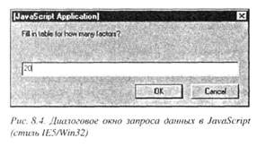 Последним диалоговым окном объекта window является диалоговое окно запроса (рис. 8.4). В нем отображается определяемое разработчиком страницы сообщение и выводится текстовое поле для ввода ответа. Две кнопки, которые присутствуют в диалоговом окне, ОК и Cancel, позволяют пользователю закрыть диалоговое окно с двумя взаимоисключающими исходами: отменой всей операции или принятием того, что введено в текстовом поле.