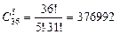 Решение. Исходы этого эксперимента можно интерпретировать как образование подмножеств, содержащих 5 элементов, из 36-элементного множества (порядок элементов не важен, а состав (выбор) элементов важен). Следовательно, по формуле числа сочетаний (без повторений) получаем