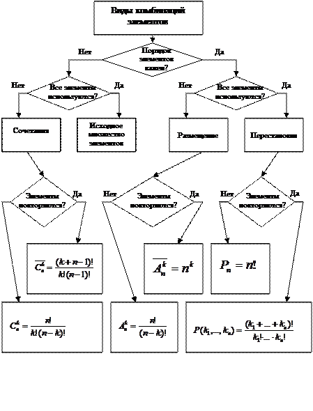 Для того чтобы безошибочно различать виды комбинаций (перестановки, размещения и сочетания), следует применять блок-схему «Комбинаторика» (рис.37)