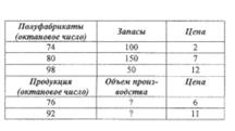 На нефтеперерабатывающем заводе имеются в наличии три вида полуфабриката бензина, запасы которых ограничены. Качество полуфабрикатов характеризуется октановым числом: 74, 80 и 98. Необходимо решить задачу смешения по критерии максимизации прибыли так, чтобы; получить два конечных продукта - бензины с октановыми числами 76 и 92 соответственно, учитывая, что октановое число смеси описывается аддитивным законом. Запасы и цены полуфабрикатов, а также цены конечных продуктов даны в таблице: