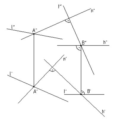Рис.7.7 Решение: Через произвольную точку М на прямой l проведем прямую n, перпендикулярную к заданной плоскости b(hÇf).Условие перпендикулярности согласно п.7.1. Пересекающиеся прямые l и n и определят искомую плоскость l(nÇl). |