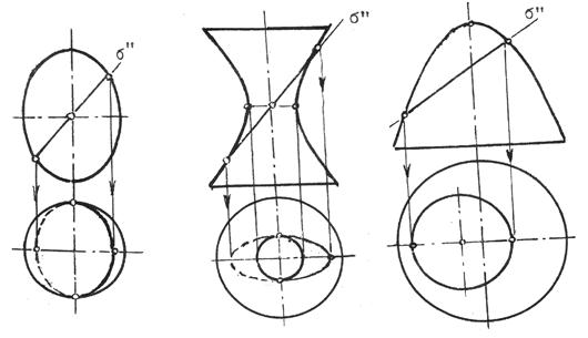 Рис.10.36 Рис.10.37 Проекция сечения эллипсоида вращения на плоскости, перпендикулярной к его оси, является эллипс, большая ось которого перпендикулярна к плоскости общей симметрии (рис.10.38). Проекция эллиптического сечения однополостного гиперболоида вращения на плоскости, перпендикулярной к его оси, является эллипс, малая ось которого перпендикулярна общей плоскости симметрии поверхности (рис.10.39). Проекция эллиптического сечения параболоида вращения на плоскости, перпендикулярной к его оси вращения, есть окружность (рис.10.40).